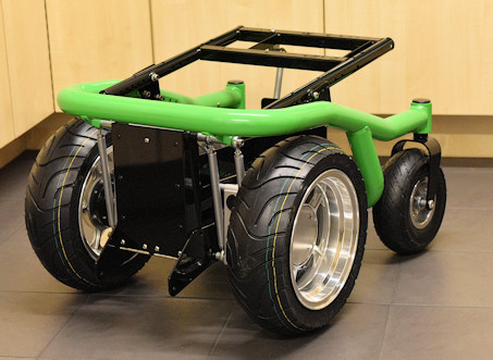 It uses a few parts from a Sunrise medical F55 chair inc the (modified tubular frame) but the rest is 90% fabricated from metal, or using parts from other disciplines. Including wheels, tyres, motors from a different chair, electronics, and huge capacity SAFE lithium ion phosphate batteries, etc. There's not a lot of this you can buy off the shelf.