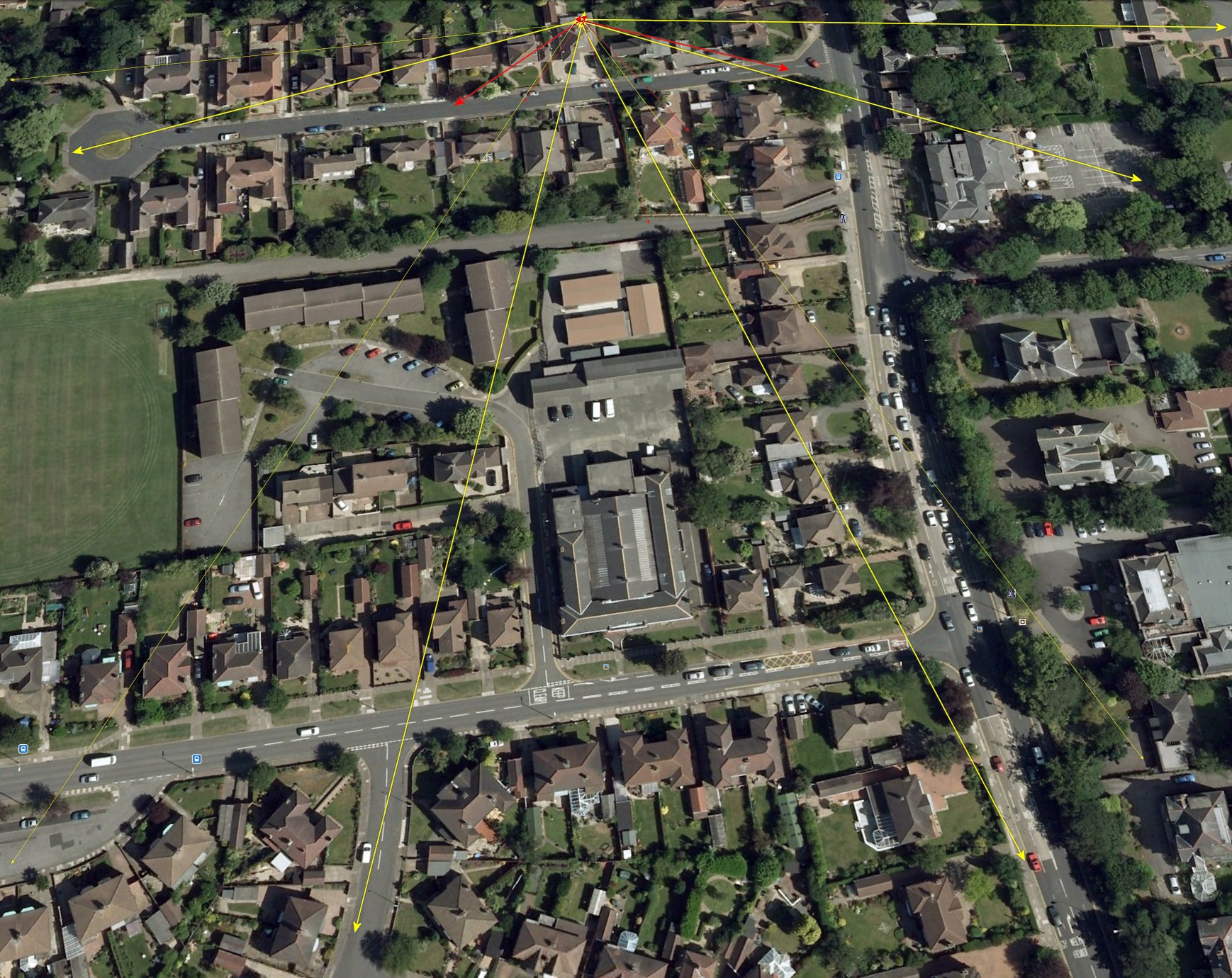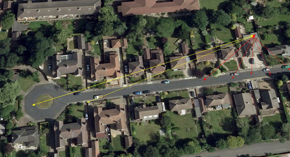____________ boosted 2000mW ___________ un-boosted 200mW Transmitter was located indoors at the rear of my house as shown above. Transmitting through brick walls and cars. Arrows indicate the point where the light on the receiver went out as I move around. 2.4ghz goes through plenty of houses and brickwork once boosted. This gives 3 or 4 times as much range even going though about 5 or 6 times as many obstacles. Bigger map here. Finer arrows mean one or more satellite RX flashing. Heavy arrows means MAX range. ___________________________________________________