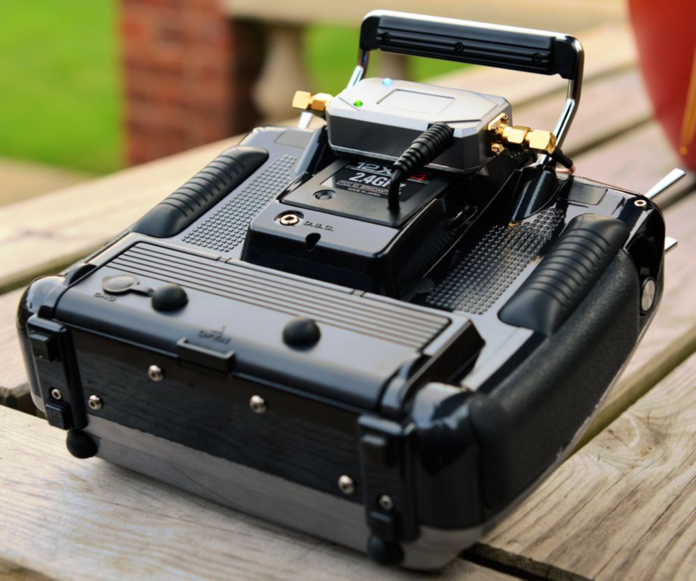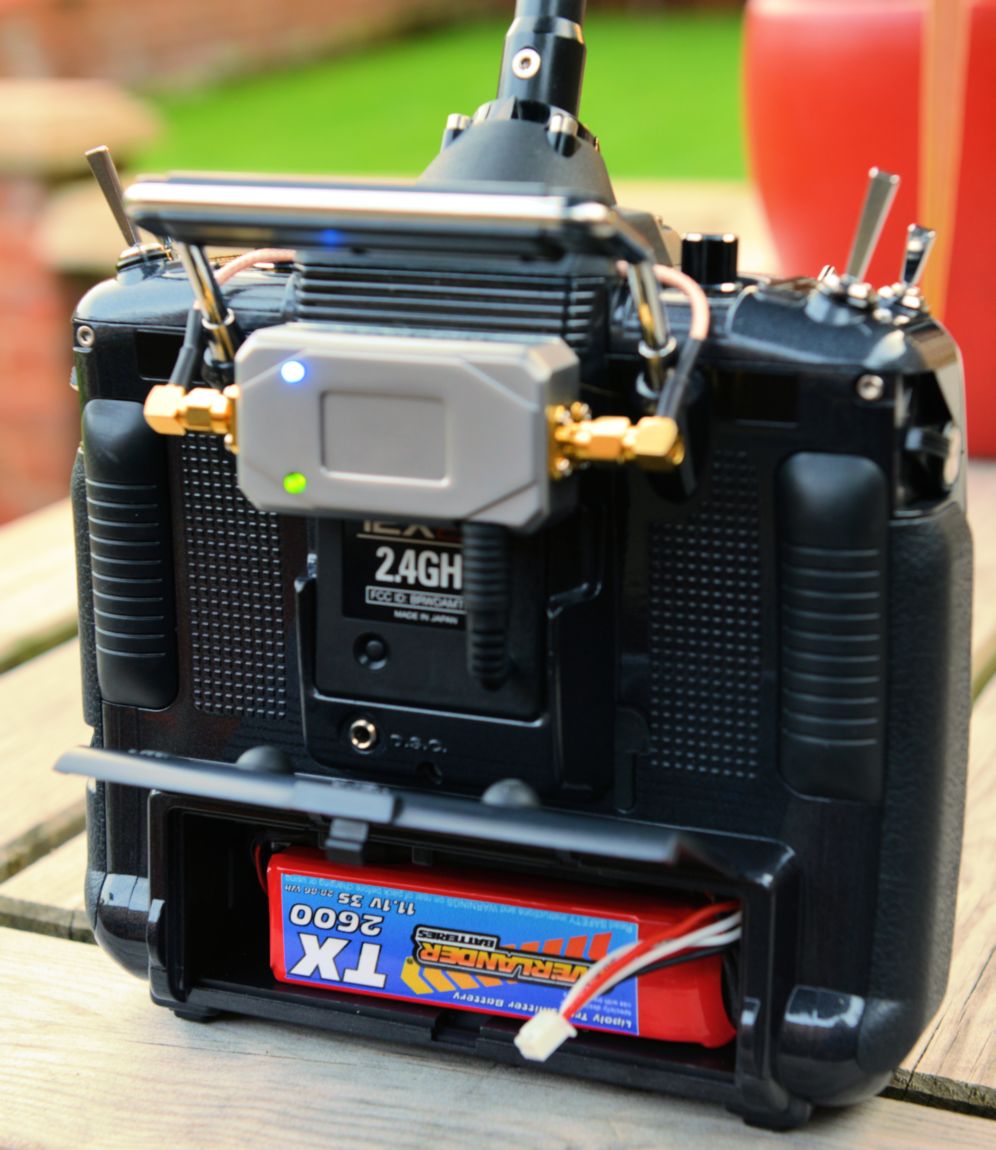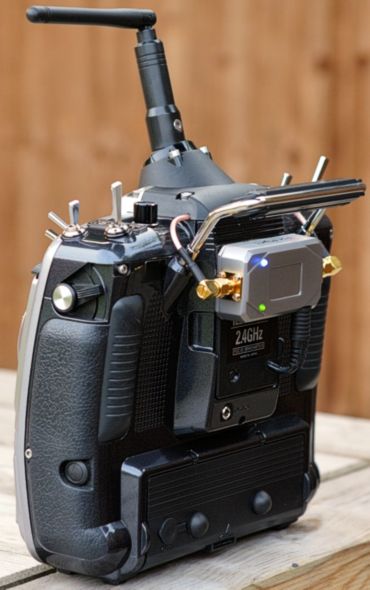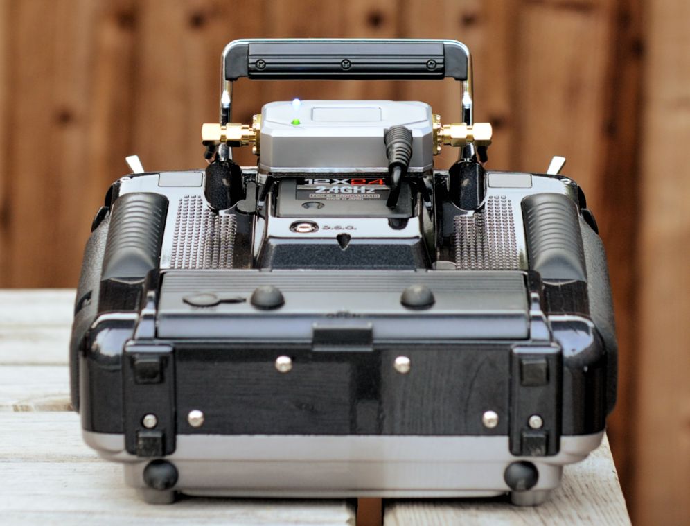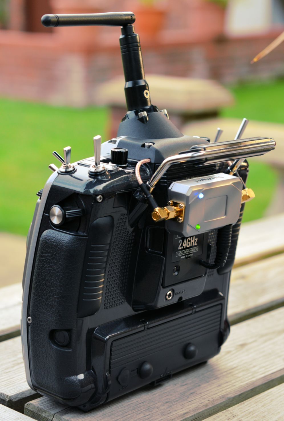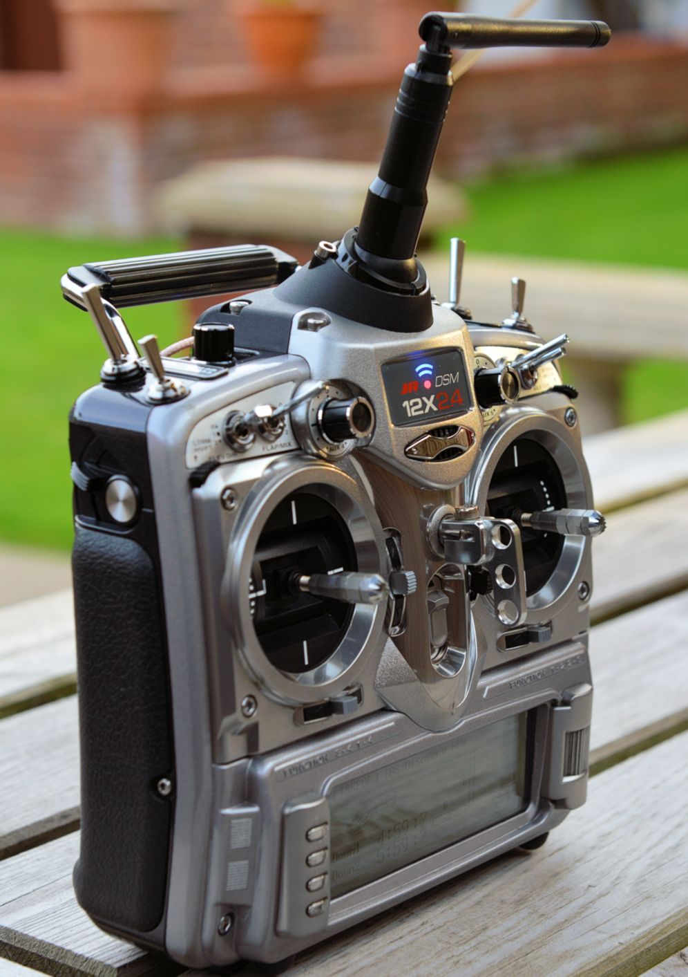 I LOVE THIS JR 12x TRANSMITTER! It FEELS right, its all MAGNESIUM shell feels good. The front, the back, the sides are lightweight rigid metal. Its solid. And it feels perfect in the hand, and none of the newer Futaba, JR or Spectrum stuff compares. In comparison they LOOK like what they are. Cheap Chinese made radios. They look and feel plastic, because they are. All creaky, and nasty and styled like a star wars toy or something. This just works, is solid, and has beautiful build quality both inside and outside. Unlike all the cheap stuff its also packed with quality components. This is no empty cheap plastic box. I wouldn't have any of the 'new' sets as a gift after using this. So I decided to convert this 12x to DSMX (not technically available in the UK) and give it far more output power. The ultimate transmitter for me!! As of summer 2013, you can keep all the modern plastic junk! I wasn't about to wreck my very expensive JR 12x Transmitter! So if I wasn't completely sure about doing this, and doing it properly, I wouldn't have attempted it. This conversion uses the STOCK 2dB gain 2.4GHZ antenna that the transmitter came with, and the same single transmitter battery I always use (a LiPo 2600 mAh with 2 voltage reducing diodes in this case), A neat permanent solution. As you can too! And no dangers, no extra switches, no voltage regulators, no extra batteries etc. No wires hanging all over to rip out and nothing in the way of your fingers. Just 4x the stock signal strength/range.