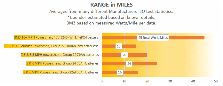 <<< 1. HUGE 10 to 20 YEARS SERVICE LIFE. Fit and forget them. They can easily OUTLIVE the powerchair. IF IMPLEMENTED CORRECTLY. Or be no better than lead if not. Lithium batteries don't reward a hard life. They hate high current draw. This seriously shortens service life. Hence using the HIGH C RATE HEADWAY CELLS! And then use the actual power in amps at a very much lower rate instead. To give them a nice easy life. A bigger Ah pack allows this. They live longer with a lower Amp (lower current draw) being taken from them on average, if the battery is bigger! Big capacity = good here. They also live much longer with less average depth of discharge. And again the bigger the pack Ah is, the lower the average discharge level. Fitting bigger capacity battery (larger storage in Watt/Hours) instead of the old small Lead battery, means that both these ideals are realised. Low DISCHARGE LEVEL, and low AMP DRAW per cell. And its easy to do this too! Since lithium is both MORE ENERGY DENSE allowing you to fit a lot more Ah in a given space, and is lighter as well. NEVER just fit 70Ah of Lithium battery to replace the same old 70Ah of Lead battery for e.g. Because the Lithium battery service life will be drastically reduced and may well be no better than the old lead battery we used to use. So again BIG capacity = good here. Treated gently (by using much larger Lithium battery capacity) we expect to get greater than 2000 full discharge cycles. And 10's of thousands of partial cycles. Rather than the much lower figure expected if the battery was the same size as the lead battery you replaced. Plus you would also miss out on other huge benefits that lithium allows such as: 2. HUGE RANGE. The BM3 chair has around 3x (actually more) of the range of a normal high end powerchair, even with its much higher top speed capability. Not because "it uses a lithium battery". That is just marketing bull. But because it uses a MASSIVE correctly implemented Lithium battery. Because lithium is much more compact and energy dense and also lighter, it allows us to cram in a much bigger amount of electrical storage capability into the same old battery space and still save around 50lb in weight. This is one of the main advantages of using Lithium. So always get as much Lithium battery storage into the chair as humanly possible! You are aiming to get almost double the Ah or Watt Hours in there compared to Lead. Or you failed. In the BM3 powerchairs case this is more difficult to calculate. Because the voltage is also increased to almost double at the same time. But we do this simply by converting it to Watt/Hours. The battery in the BM3 has well over 3x the electricity storage capability of a set of Group 24 batteries as used in a high end powerchair. Or 3,240 Watt/Hours USABLE! Some 3.9 times better than a Lead powered wheelchair. That's is a simply HUGE gain.