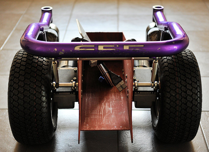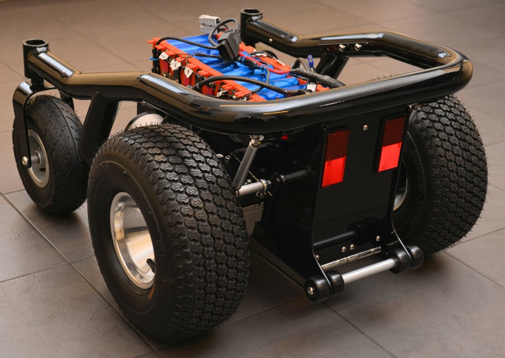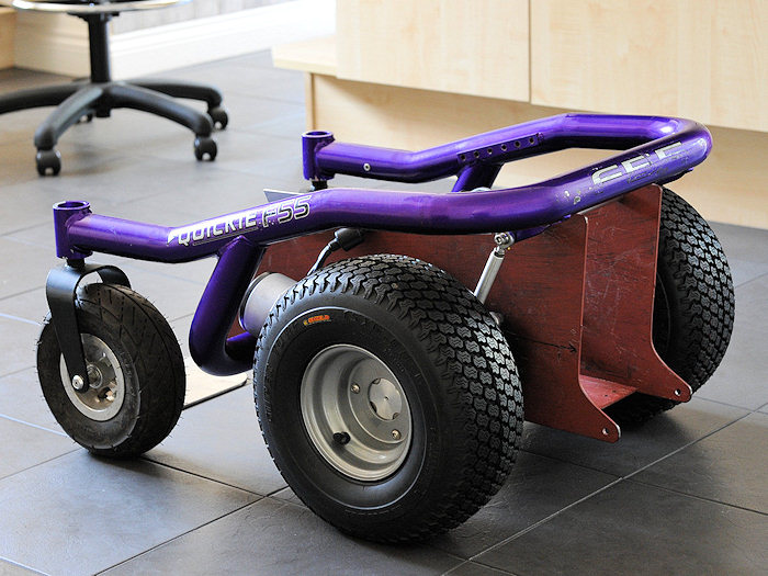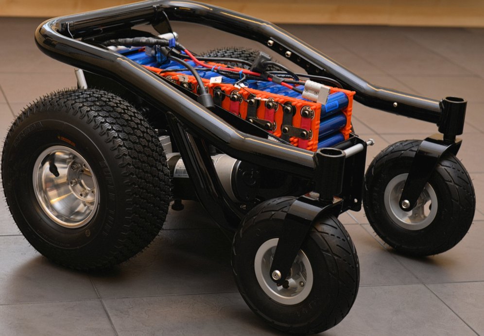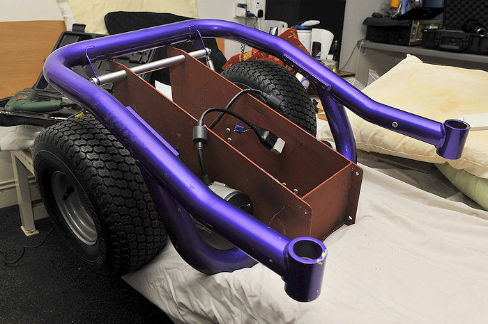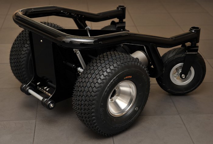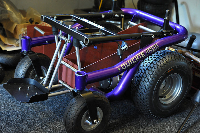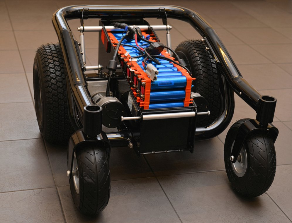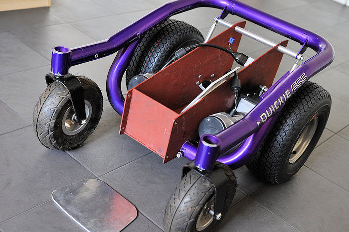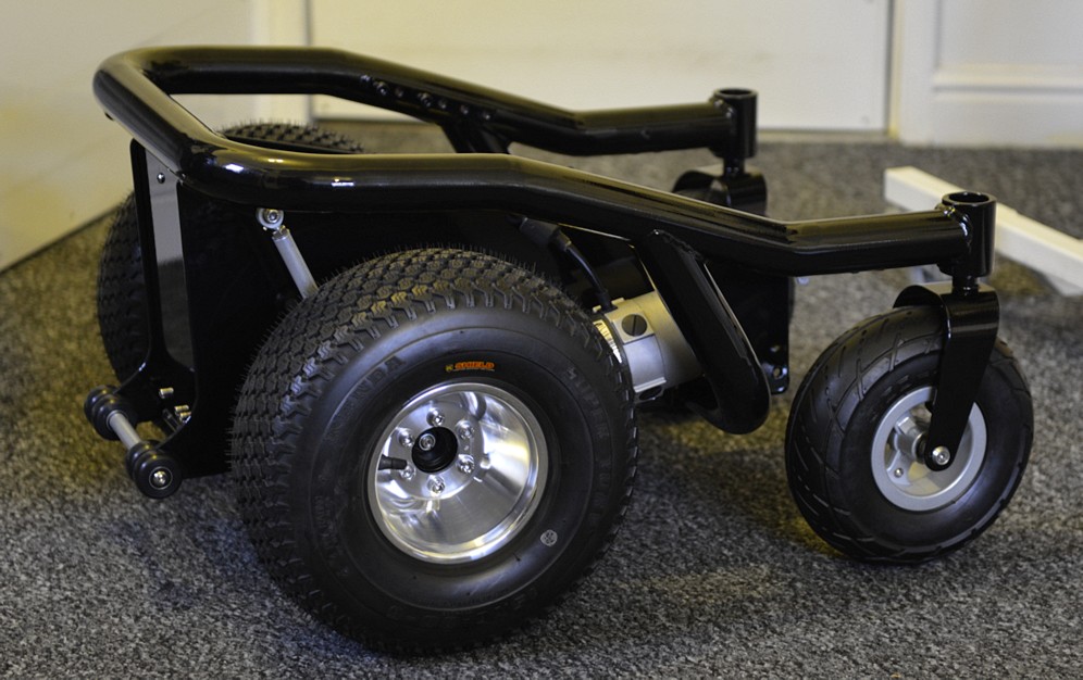 Here is a picture of a partly completed BM4 power wheelchair sat on my kitchen floor! >>> CONTINUED: This new layout/centre section allows 6 inch wide "fat" all terrain or turf tyres (tires), to be fitted for a bunch of very good reasons! (later!) while keeping total width to 26 inches, because I want this chair to be OFF ROAD and OUTDOOR as well as totally INDOOR capable. Wider that 26 inches is simply too wide!!! An extra inch here & it feels like a truck indoors. 26 inches is as narrow as any indoor powerchair with a fat guy sat in it can be! And the same as most other inferior "Hi end" modern powerchairs with full sized "Group 24" batteries and "skinny tyres" can be... It means the best of both worlds. Indoor width, and outdoor all terrain tyres for ride comfort and snow/mud/sand capability. Most parts here are fabricated from scratch like this complex centre section, mentioned above and built to my own design. It puts anti tips, motors, wheels, and total length etc to exactly where I want them to be. But it also has to be capable of 3 different lead battery configurations, and 2 different Lithium battery setups. While being "crash safe" as I drive a van from this powerchair. It also needs to ensure 4 inches of ground clearance, bigger motors, fat 6 inch wide tyres, and get the C of G in the correct place, provide mounting points for footplate, seating, vehicle tie down, correctly position the anti tips, look cool, and be easy to make at home! To produce a far better chair than the one the frame rail came from. Lots of very careful design and no compromises here. It defines the whole powerchair! Some parts are replaced with other components, often from non mobility devices. E.G. the high powered high voltage Roboteq Controller! Or the quad bike wheels and tyres, or the Lithium battery. Or the mass of karting derived "rose joints" or industrial rod ends, & fabricated bars and footplates, etc. Or the motors from a different powerchair. Or the hobby based Hyperion Charger! etc.