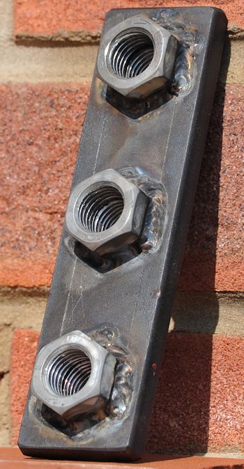 This is the chunk of metal to be welded to the bottom of the powerchair. It allows a strong short 16mm bolt (actually a tow bar bolt) to be screwed into the bottom of the powerchair in 3 different positions.