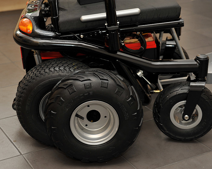 Notice the 12 inch floor tiles. This chair is still narrow even with a full 12 inches of shock absorbing low pressure high floatation puncture proof Kevlar lined tubeless tyres.