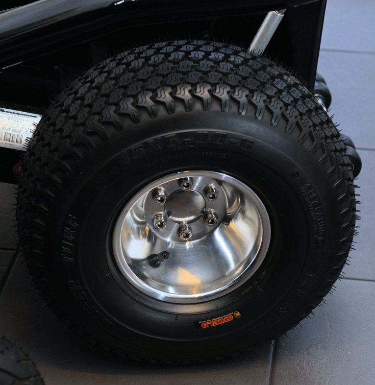 We are now using HEGAR alloy wheels, and different wheel adapters. These are much better quality, and properly designed for these tubeless tyres. They are split rims, and sealed with silicone rubber in the centre. Here you can see the high quality gloss hard powder coating on every part. Every bolt is stainless steel, and every bearing also is stainless steel. There are 16 stainless steel bearings in this picture! As well as two stainless steel needle bearing hinges on the battery compartment door! And 10 rose joints...