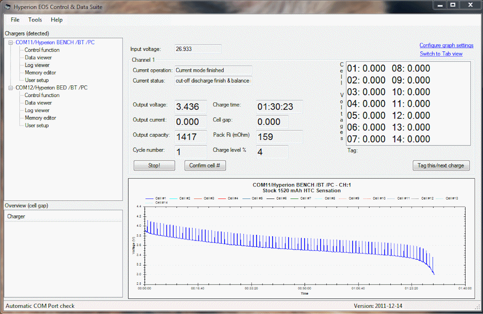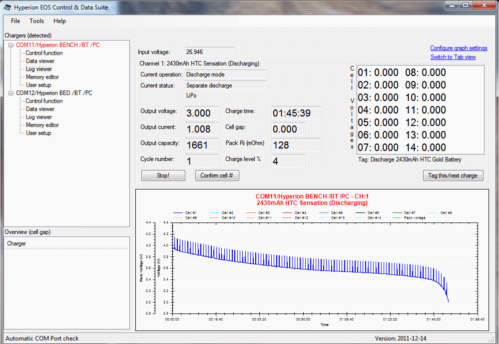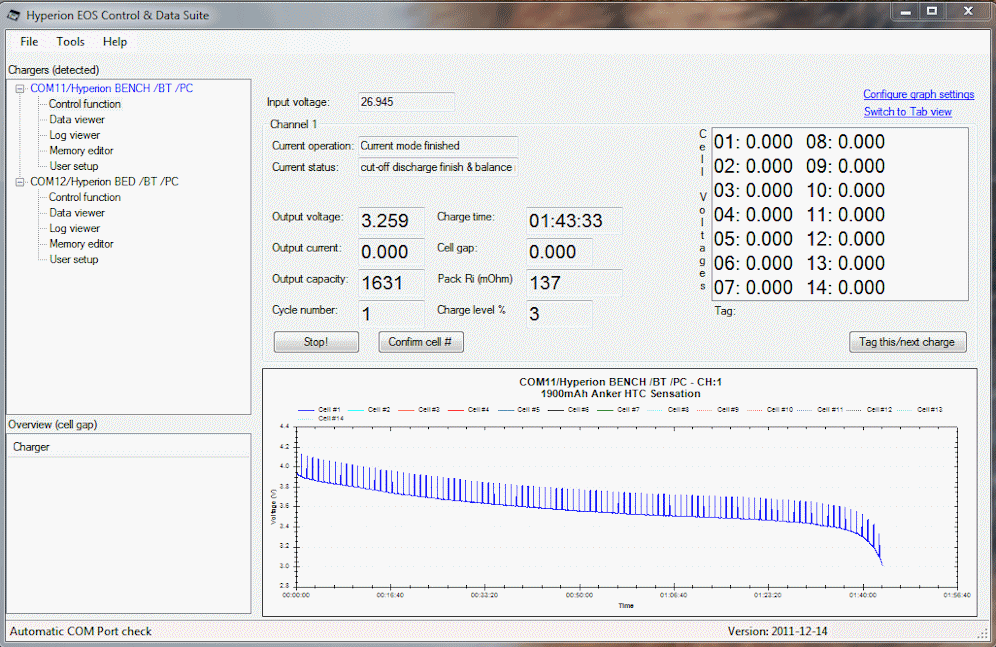 TEST METHOD a) fully charge. Phone chargers, or the phone itself cannot do this consistently as they do not all charge to the correct exact 4.200v, and even if they do, they "cut off" at low current before charge is totally complete and this allows the voltage to drop by a small amount later. Some chargers never turn off, and hold the battery at 4.200 volts indefinitely. So the length of time left on the charger AFTER it has charged effects the amount of total charge held by a small margin. So I charge at CC/CV of 4.2v @ 1000mA for 4 hours each battery, via the Hyperion charger. And I cycled each new battery 4 times before each test for consistency. There was actually almost no change in mAh in, or out, each time on any of these batteries. b) discharged at 22c at 1000mA for as long as it takes to reach 3.000 volts, at which point the battery is 99.9 percent discharged. And the lowest it should be taken without damage. They instantly bounce back to 3.3v after test load ends. 100Ma is quite a severe discharge rate, but since Lithium's don't suffer from the Peukert effect will not affect the capacity measured. c) discharged in 50 second pulses with 10 second breaks, to read ACTUAL open circuit voltage off load. And to allow resistance calculation and graphing. d) all data logged (and controlled) by PC using Hyperion's excellent charger/tester and PC software. e) Resistance is read and averaged over the whole discharge cycle sampled every 60 seconds. LOW is better! |