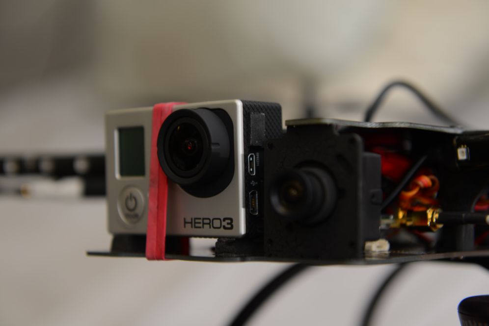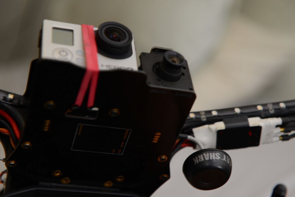 GoPro HERO3 and the FPV camera side by side. One records broadcast quality HD movies, the other sends a signal back to your goggles...