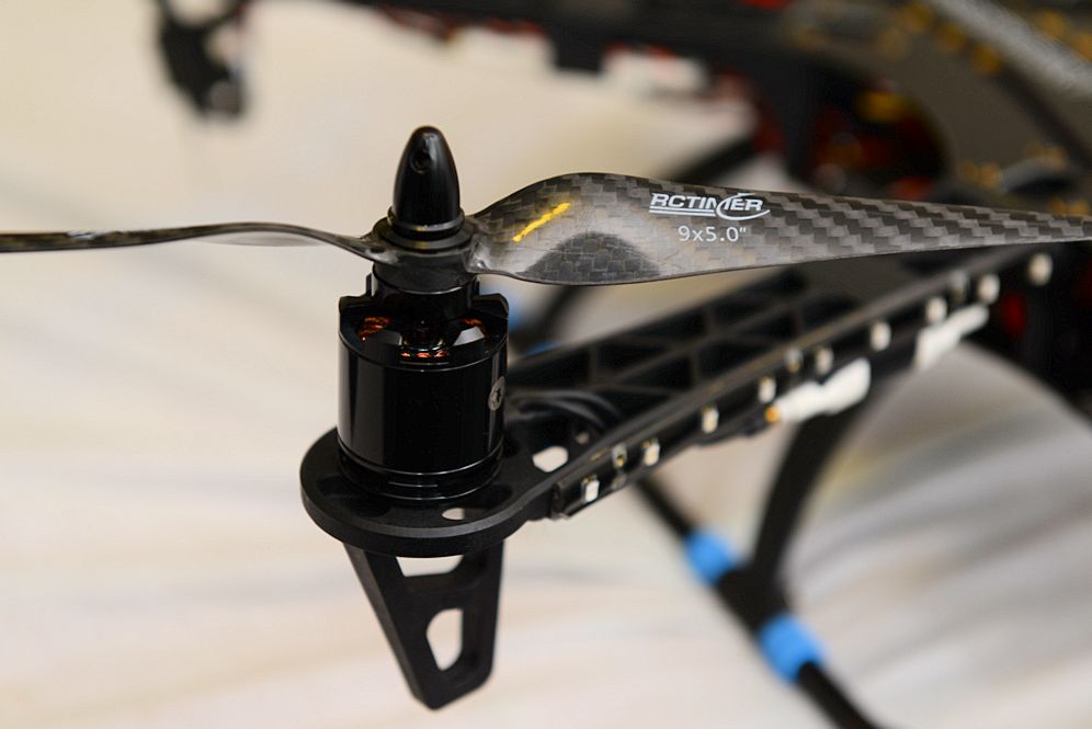 900KV Team Black Sheep motors. MUCH better than the 750kV motors, when used with the 9 x 5 propellers that are essential. 8 inch, lacks power. 10 inch is seen in the cameras view, and causes JELLO cam wobbly picture issues... The vibration frequency is just where the camera doesn't like it. So these are the best match. RC Timer or Graupner 9 x 5 or RC Timer carbon props, 900kV motors. Even so, the motor and prop must be balanced to an extremely fine level to get the sharpest cleanest camera output. It takes me 4 hours to balance a new set of props ON the quad-copter, running one motor at a time. You will be amazed how accurately I have to do this. If you want to know how, join my forum and ask! The result is SMOOTH sharp JELLO FREE video. see shapes-1080.mp4