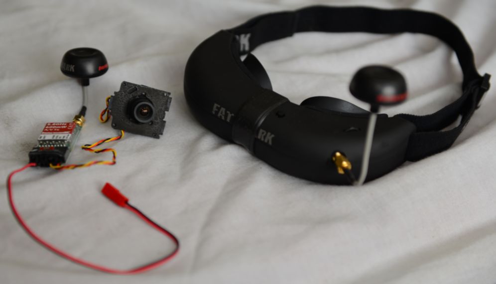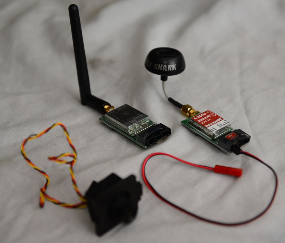 These two boards at the top are the tiny transmitters that send the VIDEO signal back to your goggles. You only need one. Top left is the 250mW output Fat Shark one, and antenna included with the goggles. It works, but lacks range. Top right is the ImmersionRC 600mW one, and this is LOTS better with a much greater range and signal strength. It also has a wider voltage input range, meaning it can run directly from the 4 cell flight battery. No regulator needed. It also has the BETTER antenna fitted than the stock Fat Shark "free" one. This makes a massive difference.. You NEED one of these, and those SpiroNET antennas. See list above! .The black blurred thing at the bottom is the tiny Sony FPV camera. Again see list. Not cheap.