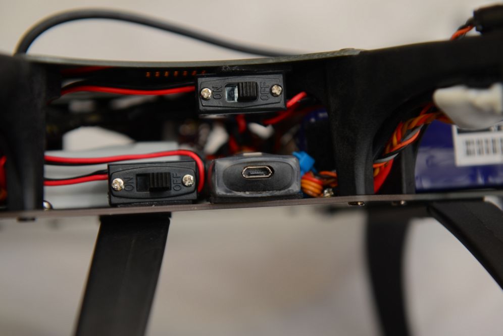 USB port for setup, switch for radio control & NAZA M & GPS on/off. And switch for FPV camera power on/off.
