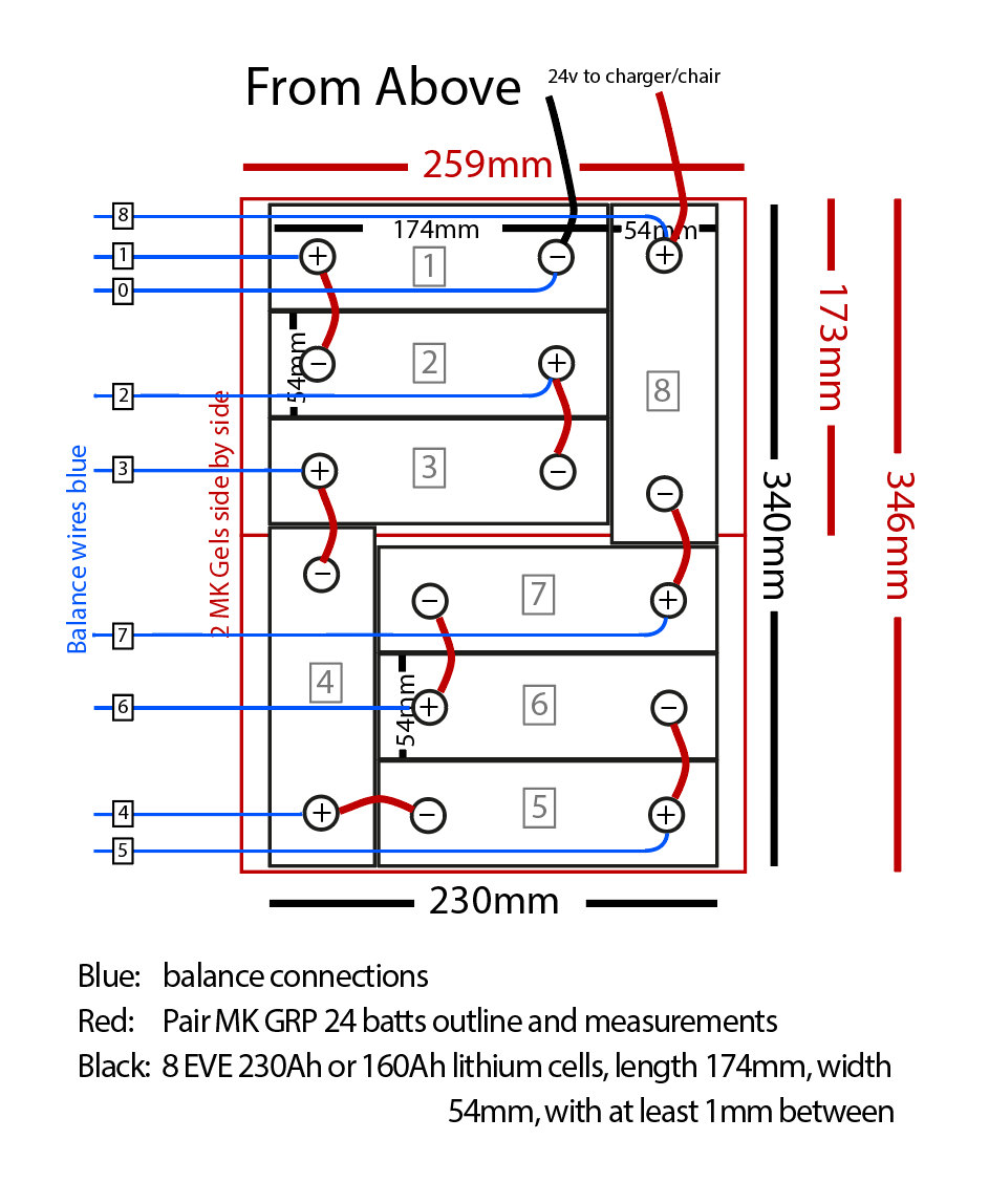 260 long, 170 wide, 220 tall. Permobils are problematic with height and the terminals aparently, I dont have one, and so as shown here the shorter height 160Ah cells must be used instead. Amy? Dont know.