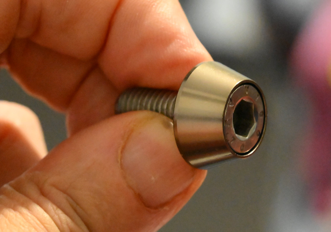 To finish this off neatly you need a 1mm thick stainless steel disk as a centre trim, cut out with a hole in it for the new polished stainless hub bolt...