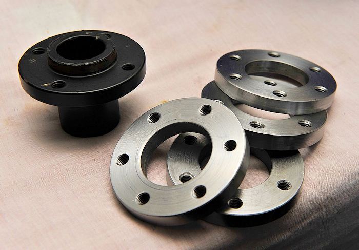Get some 6 inch flat plate alloy disks cut, with 4 bolt holes and a 50mm centre hole...