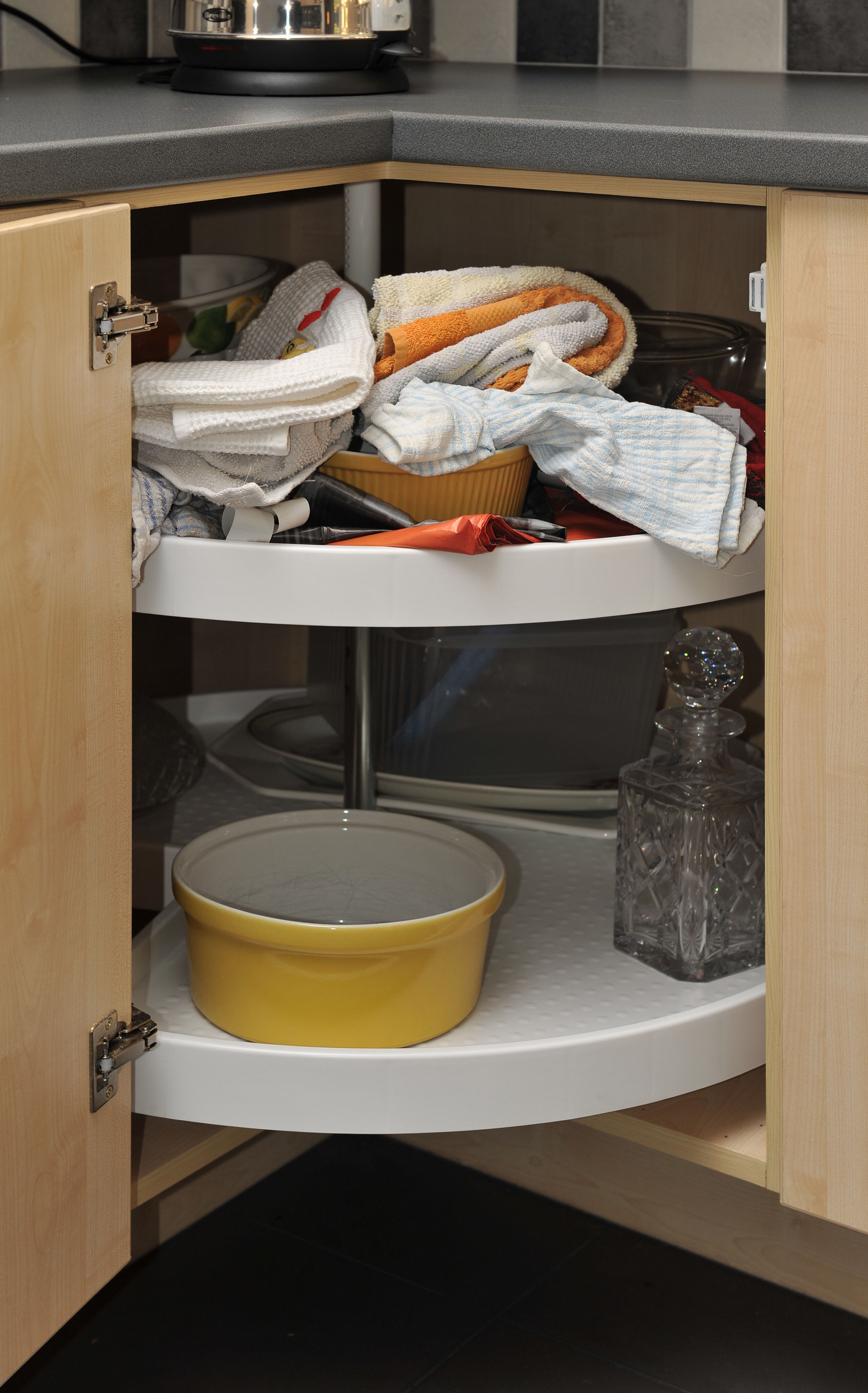 Corner units are all carousel rotating shelves so I can reach the contents.