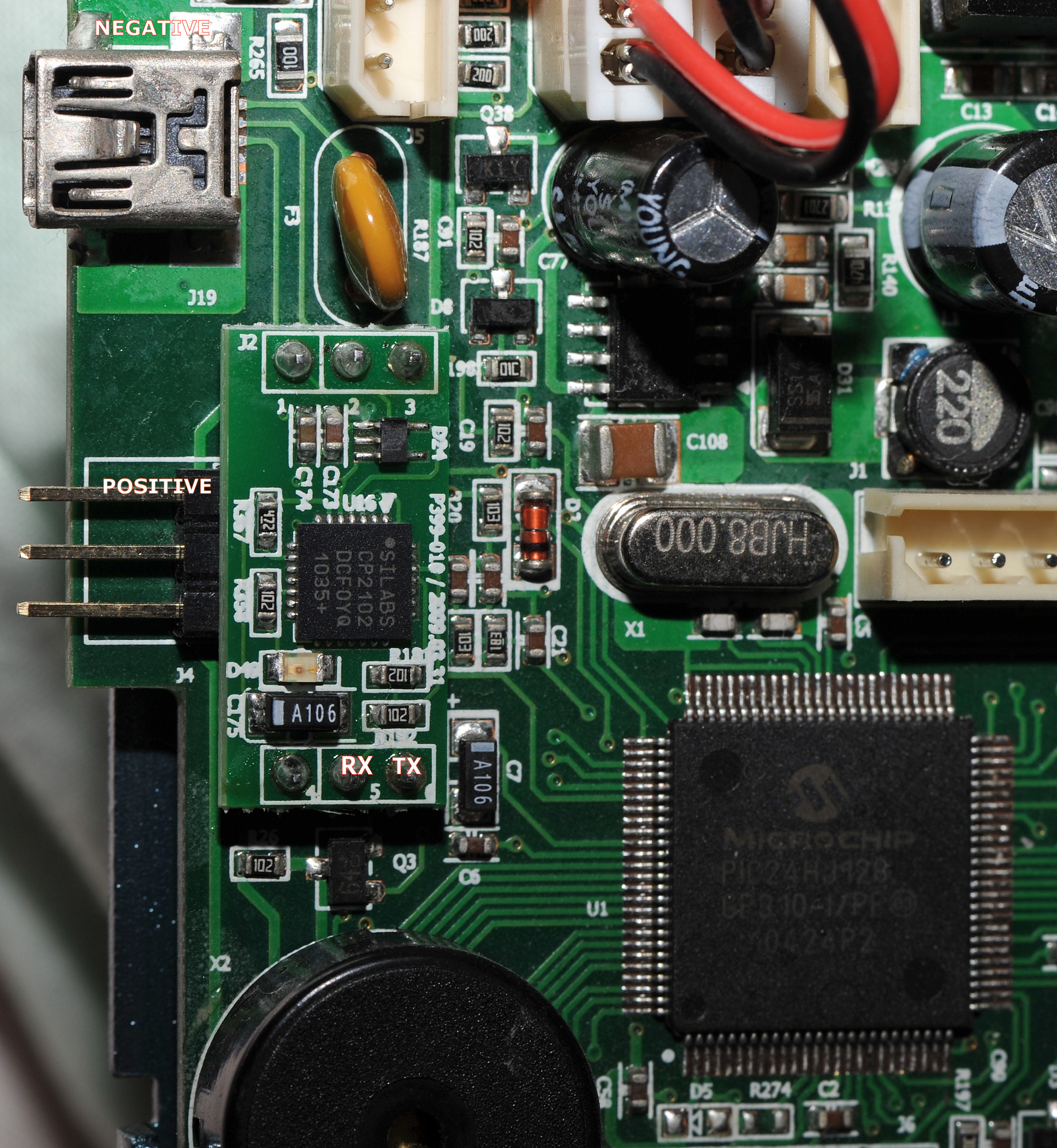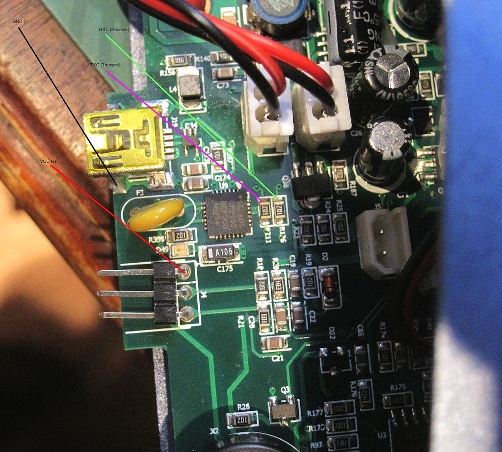 LARGE IMAGE HERE WITH CONNECTION POINTS MARKED! Obviously the POS needs power in this case from the rearmost gold pin on the TEMP sensor port. And the NEG needs a negative! This comes from the base of the USB connector. See later pictures.