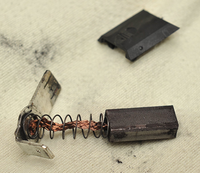 brushes above. One is shorter than the other due to wear/arcing and use. All four from this motor were the same,