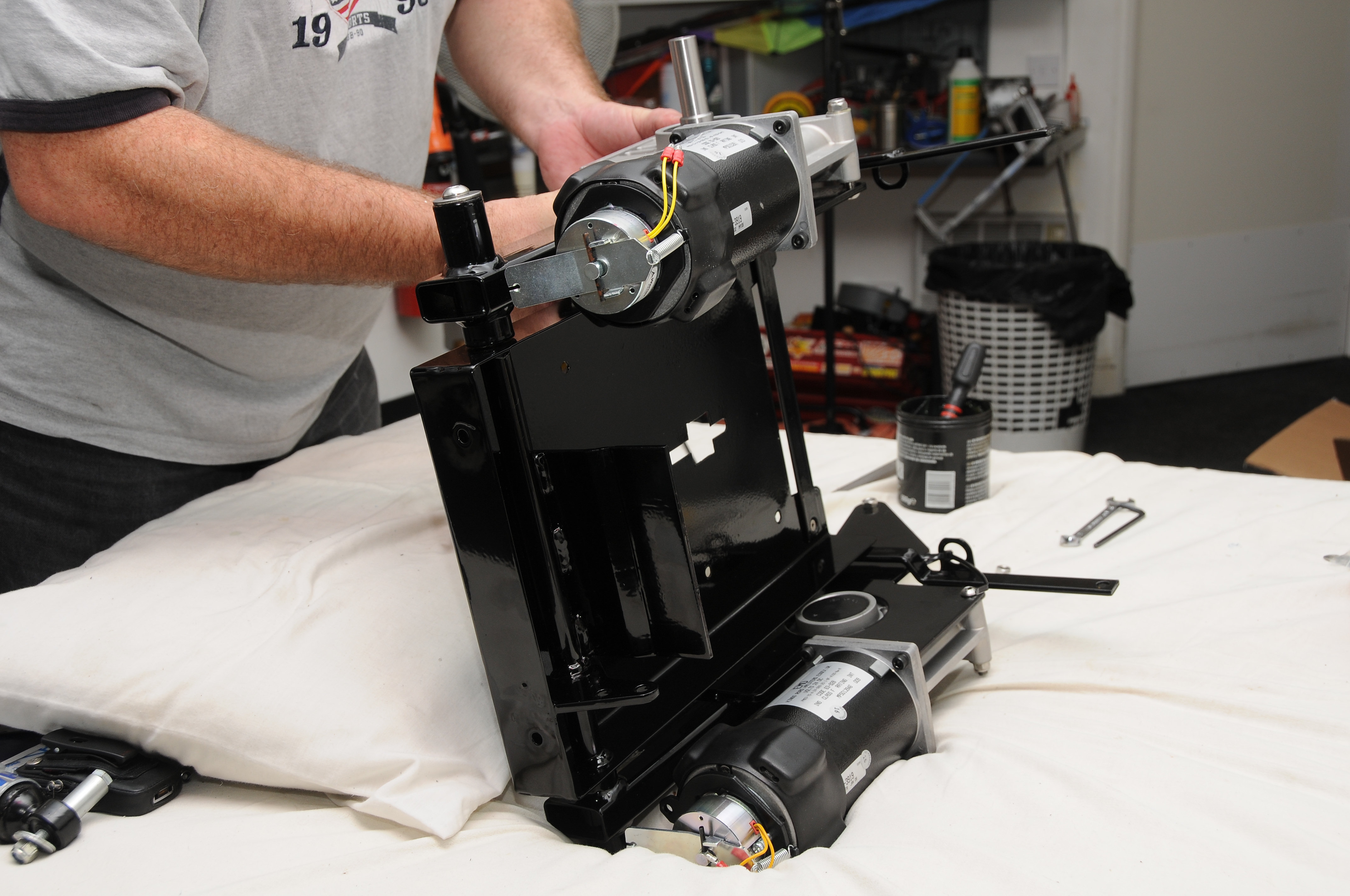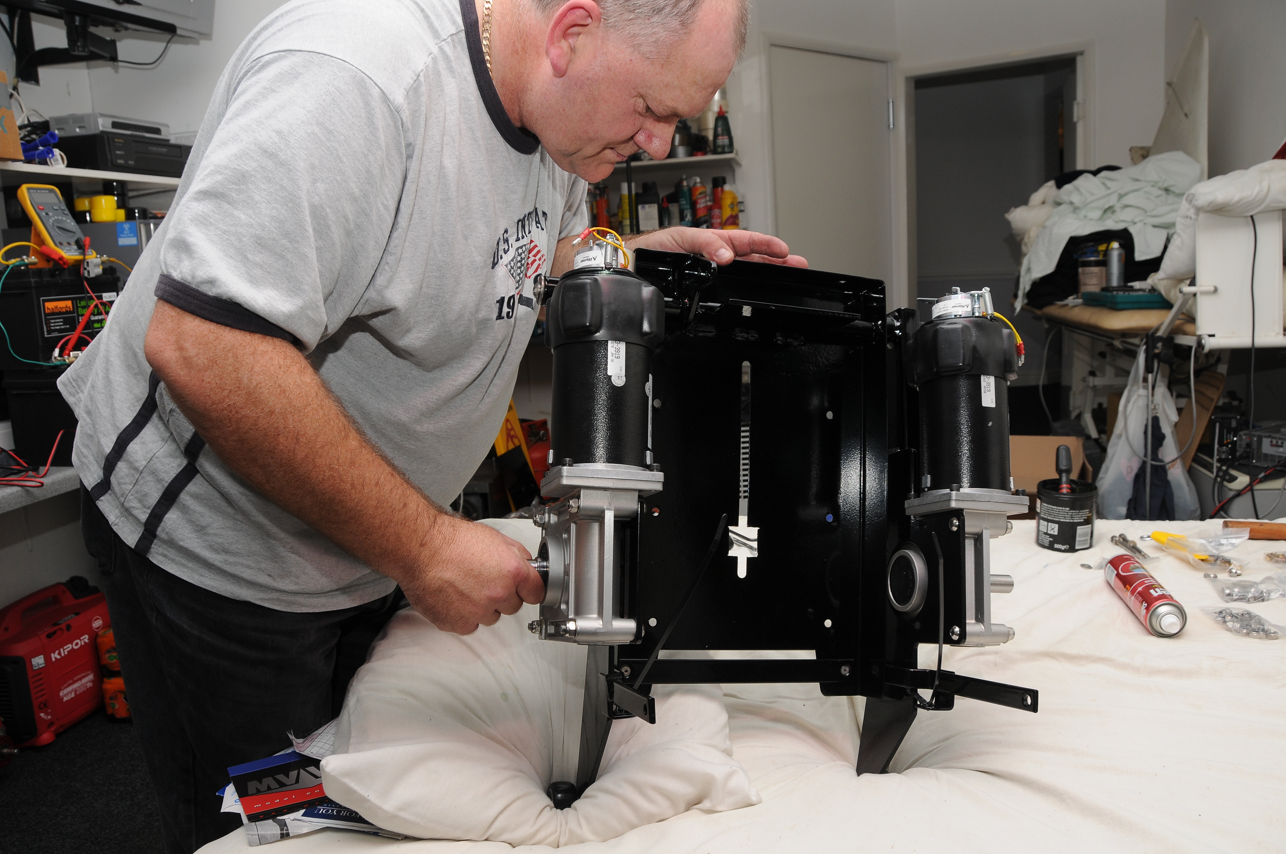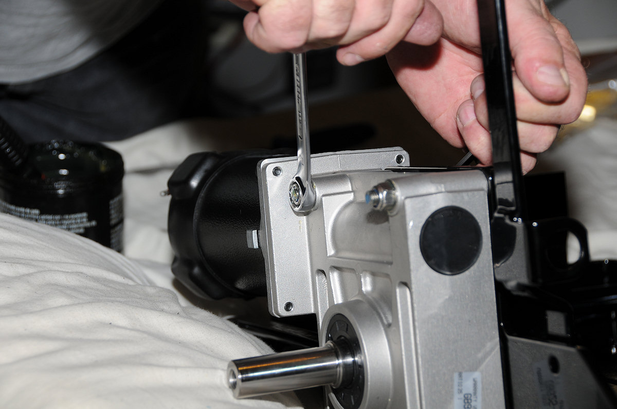 Fitting a new motor to the battery tray / swinging arm assembly. Stainless bolts