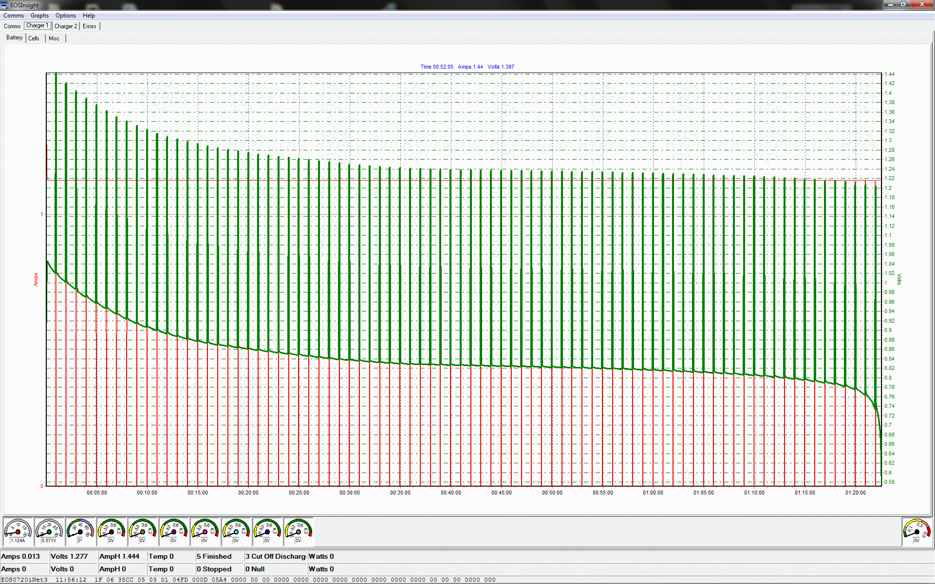 Terminated at 0.6v per cell and at 1000ma discharge rate
