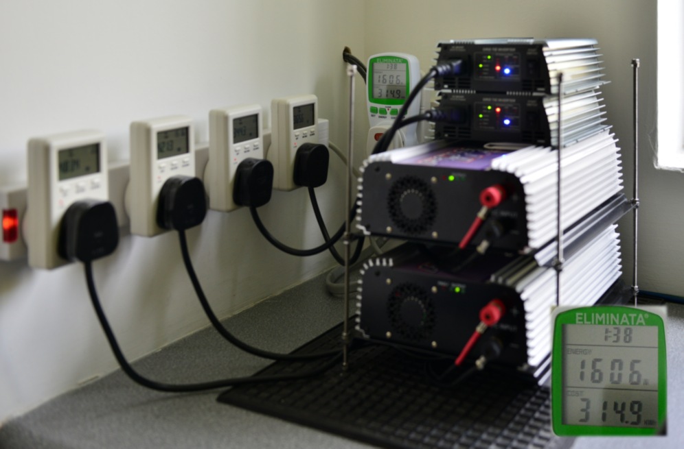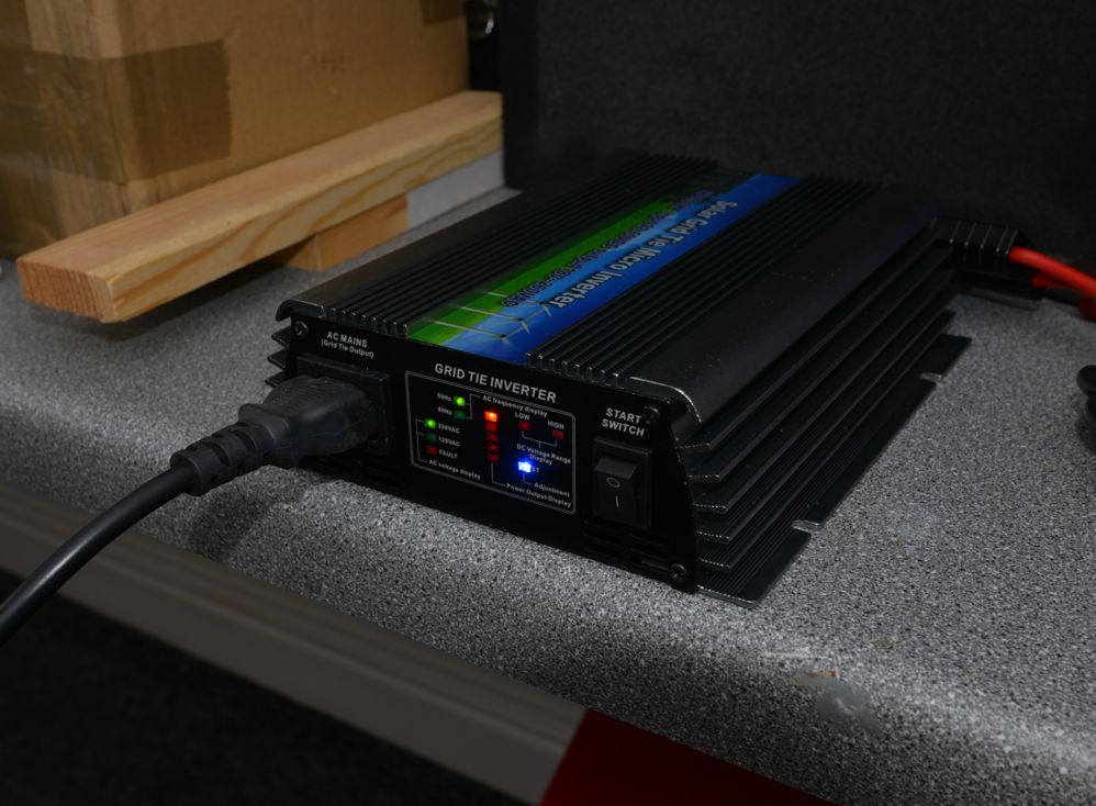 Testing on the bench. This cheap inverter is idiot proof. Just plug it into the nearest wall socket, and connect your solar panel wires. Done! |