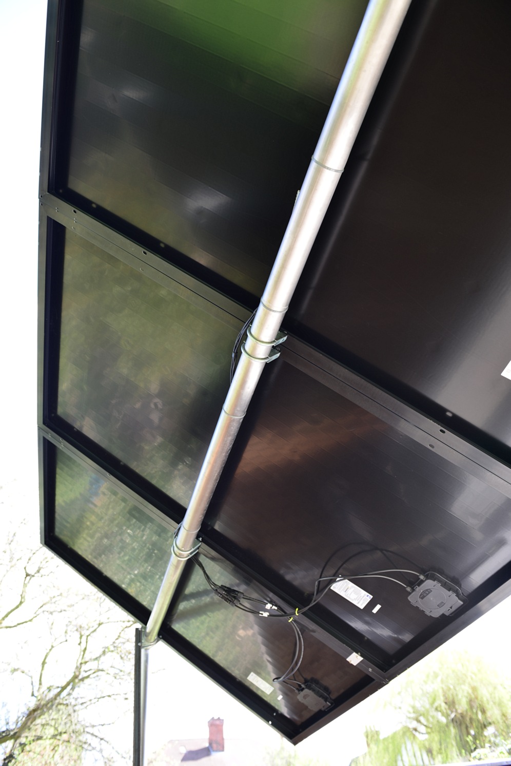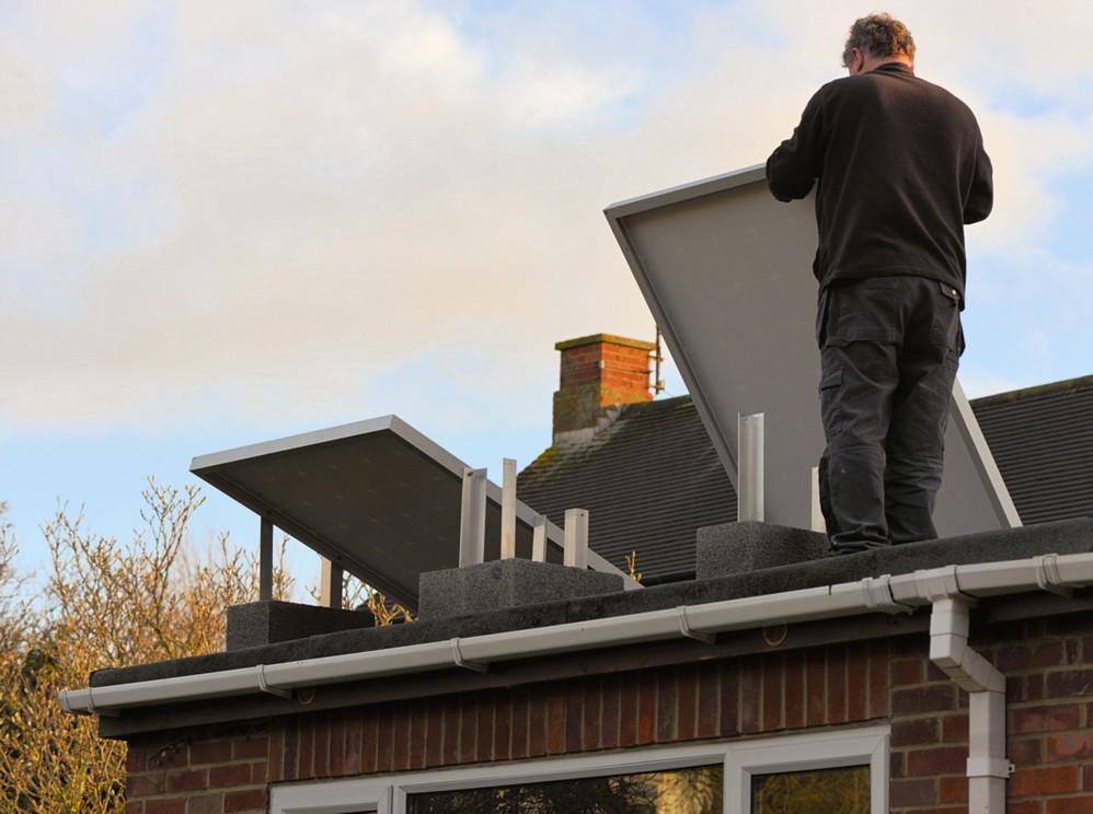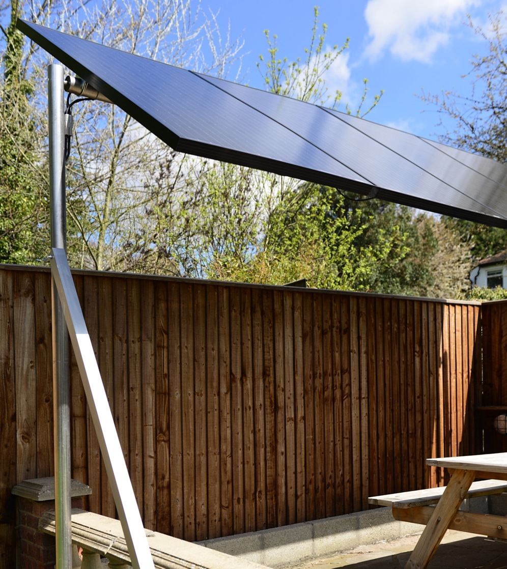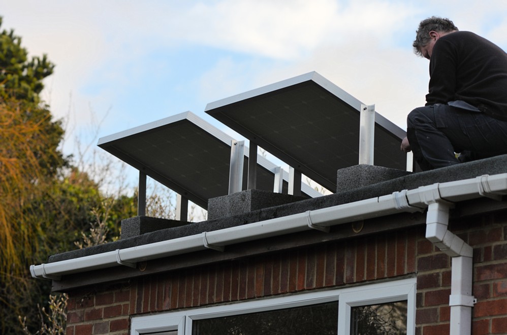 The ideal angle is south (as these are) but at 30 degrees to the horizontal, to give the best 12 month power collection power. But unfortunately, the sun is behind the rooftops in the winter months, so I mounted these at 20 degrees to maximise summer output. These will produce very little to no output in winter. Mounting: These are just hollow concrete blocks, and 50mm Angle aluminium strip, cut to length, cemented in place..