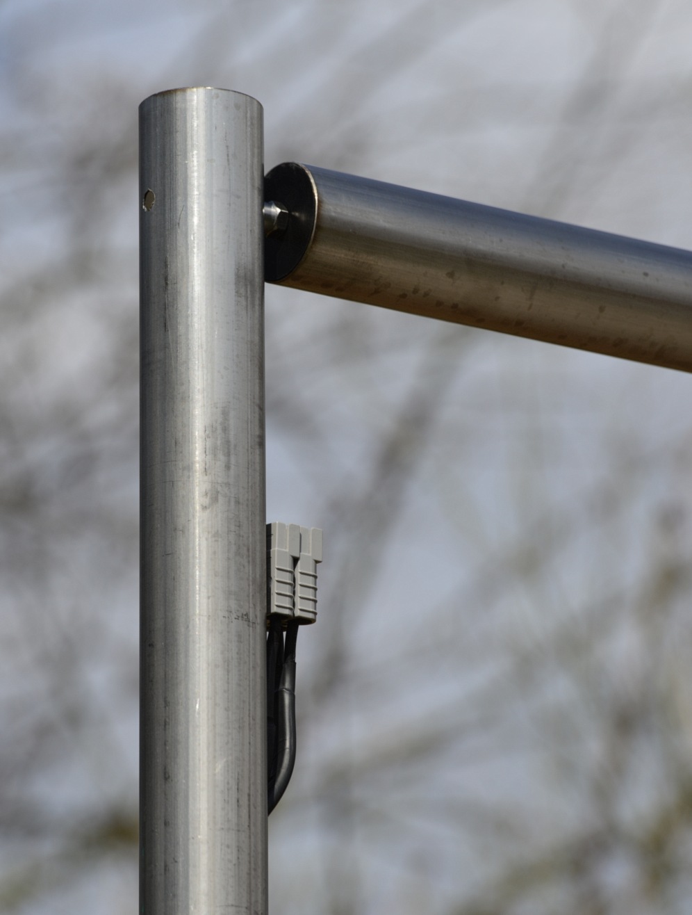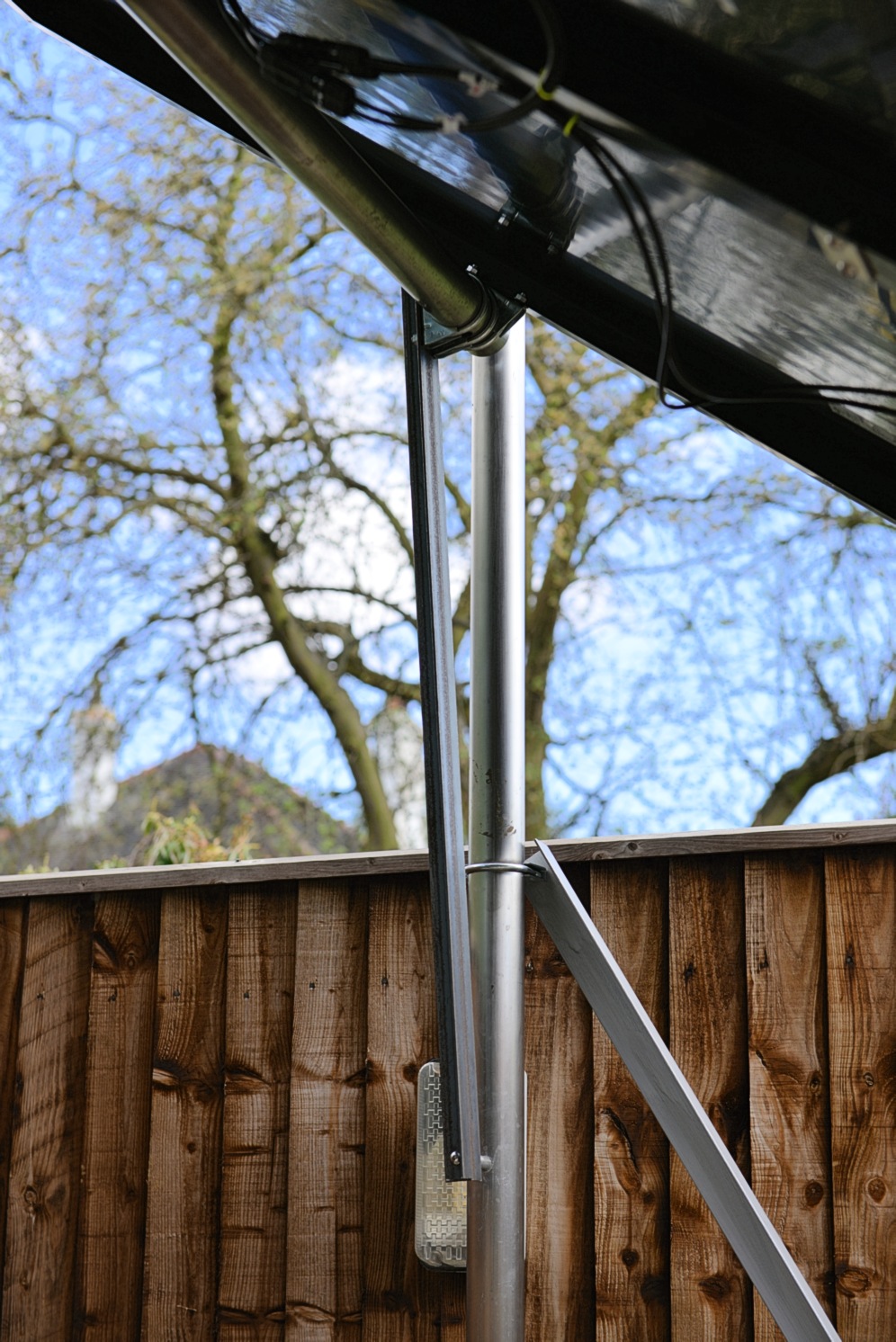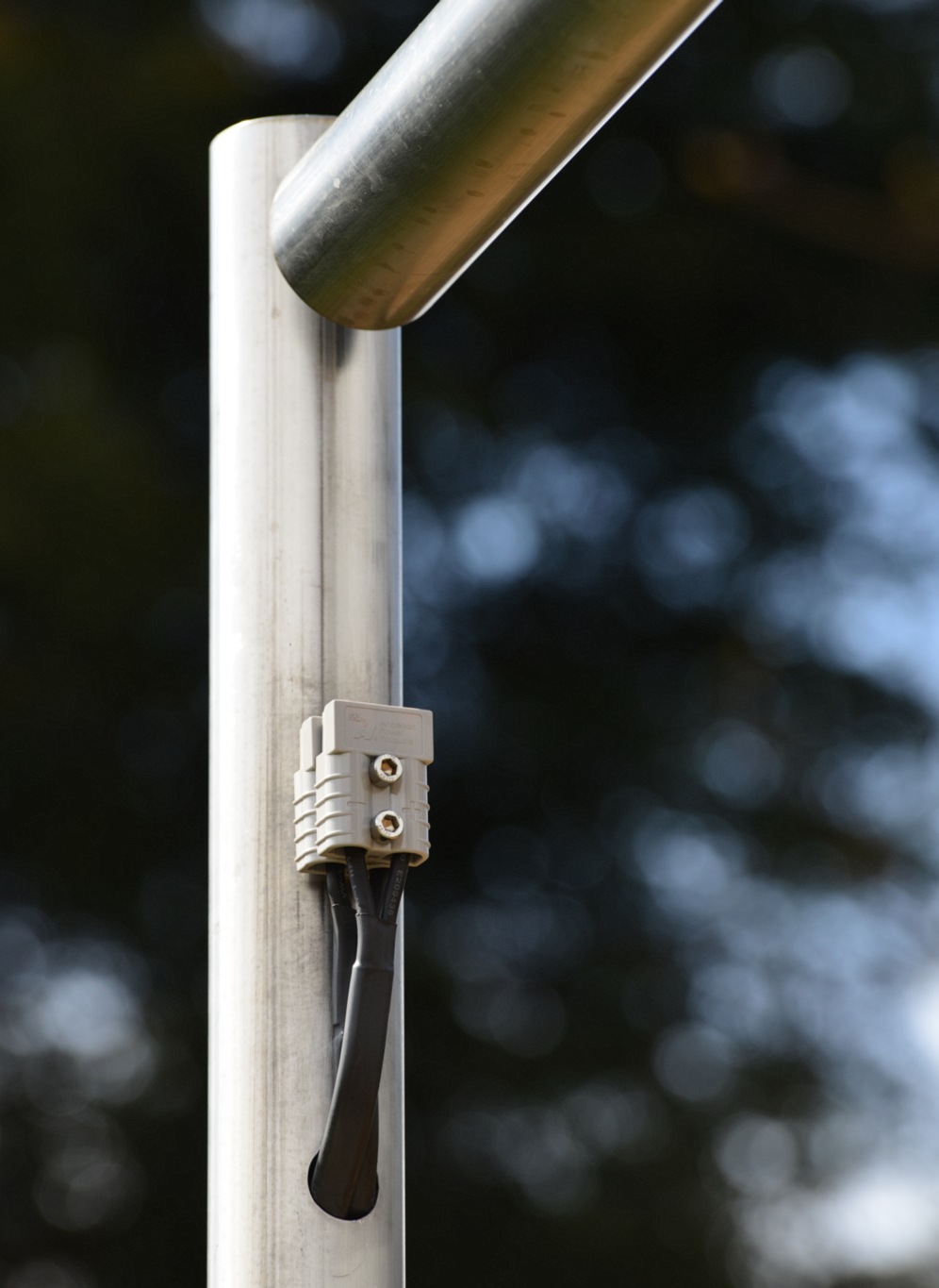 Bar fitted. Post concreted, grass replaced. Cables (2x cheap 6mm sq Grey twin and earth cable as used when fitting an electric shower), runs INSIDE this post, and under the grass to my bedroom... At the top of the pole there are 2 Anderson connectors.
