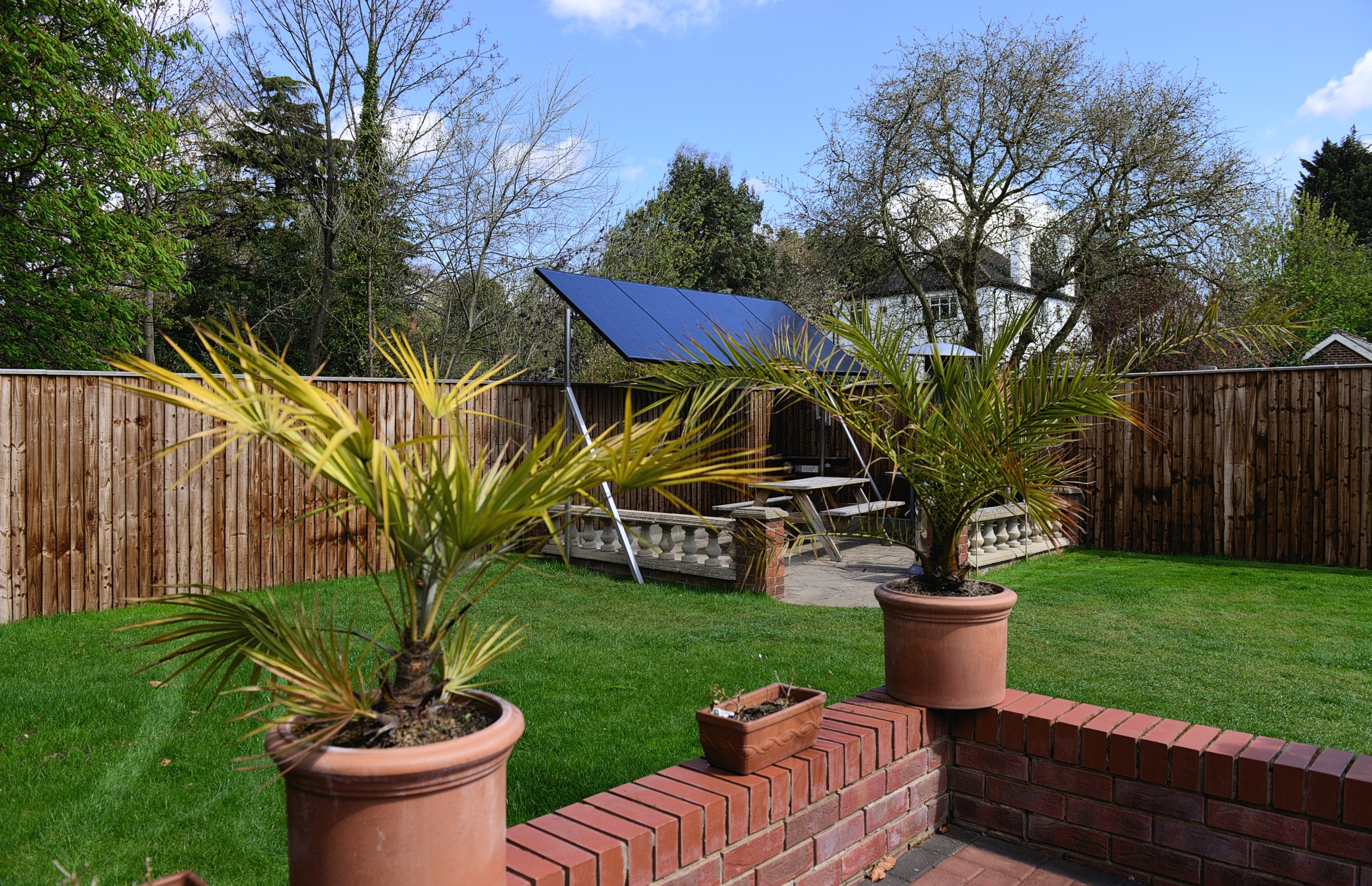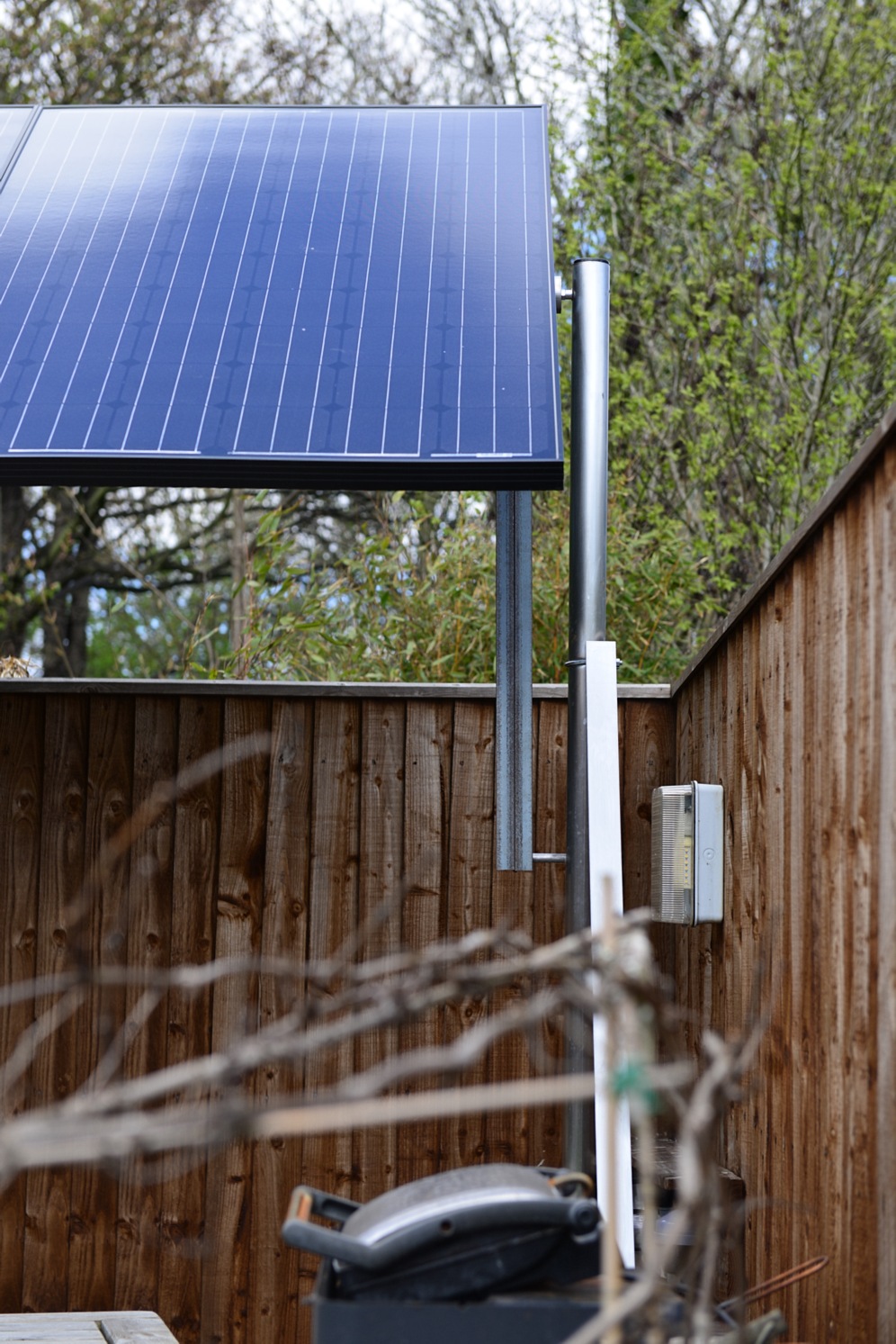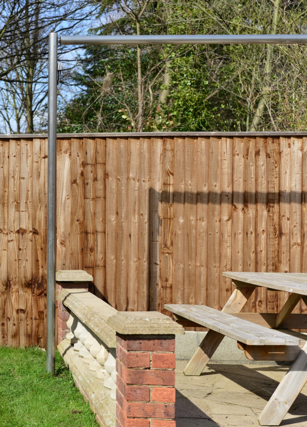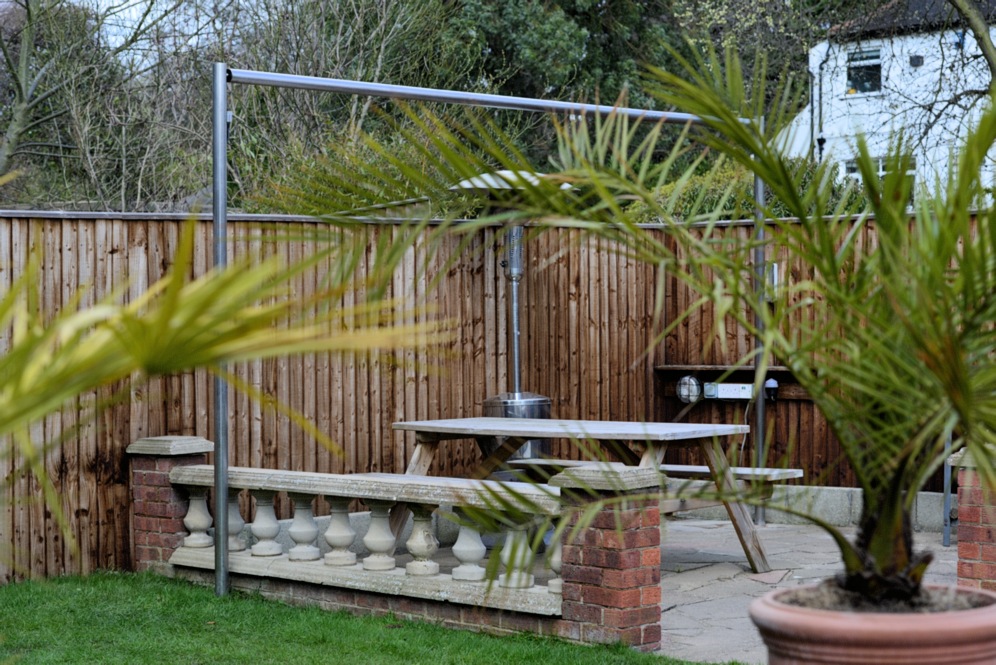 Result? Solid, cheap, adjustable. Looks horrible but once I get something growing up the legs it will be invisible! Actually here's a bigger picture from the other end of the garden. You barely notice it if you squint!
