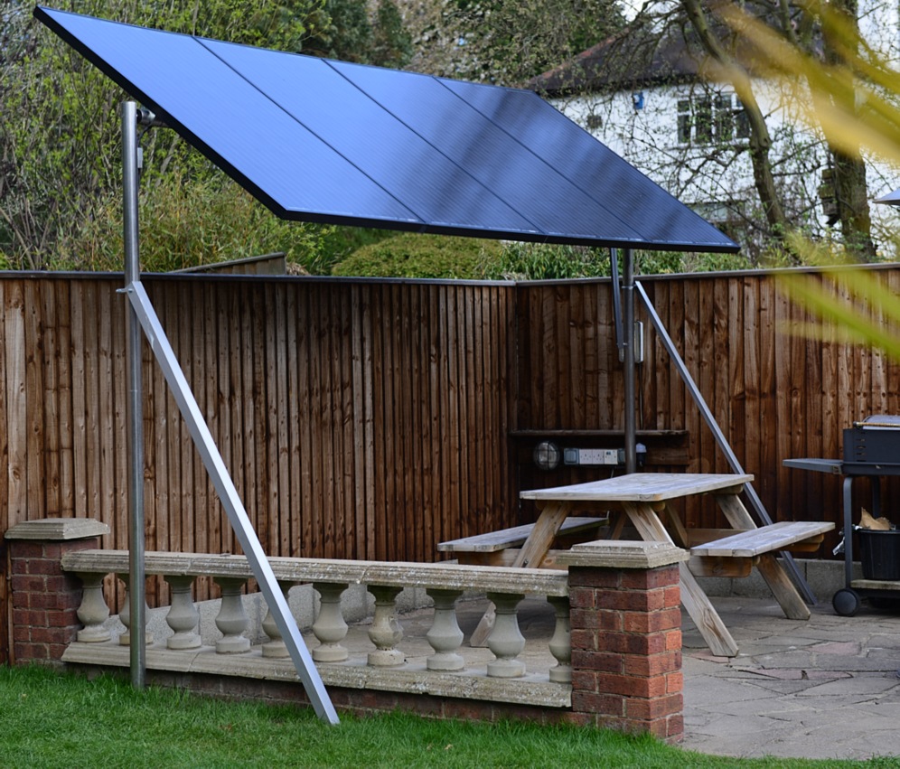 Now there are 4. These things are taking over the bench. They are spaced apart so that they cool well. Or the fans come on and this gets quite noisy. So that's 6x 250 watt panels, in two sets of 3 parallel connected. So only 1 and 3 are actually in use here. In winter sun, both arrays are making 300 watts give or take so around 600 watts total. Occasionally it goes higher than this. In thick white dull cloud (its January here and 2 degrees C) it makes just 60 watts. Roll on summer! So far this is a 1.5kw system. In summer I will add 3 or more panels at the rear of the house as a BBQ sun roof...