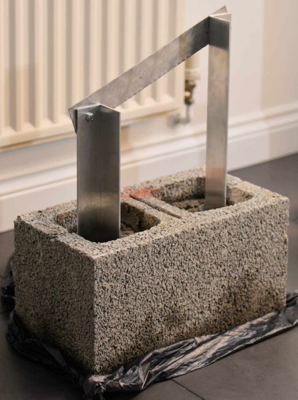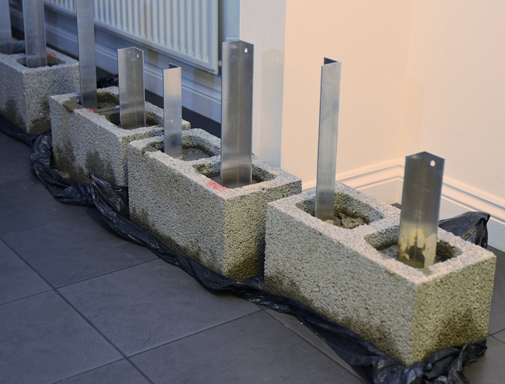 Before the cement sets, make sure the holes are the right distance apart! Note bar at the top. This is used to mark the panels for drilling too, so every panel is the same and interchangeable.