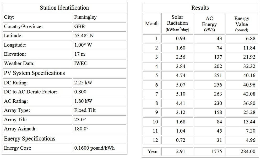 Total for a 2.5kw system is around £1739 including tax. It MAY not be as efficient as a commercial system. Or since all is in parallel it may be more efficient. We will see. I used a government site, online calculator, and plugged in a few likely figures and this is the expected result of my 10 panels: (Actually this is for 9 panels but I now have 10) So far, in May, its almost exactly as predicted by this. At least kWh per day seems like it will top 11 per day. Or 330 per month. Exceeding the estimate.