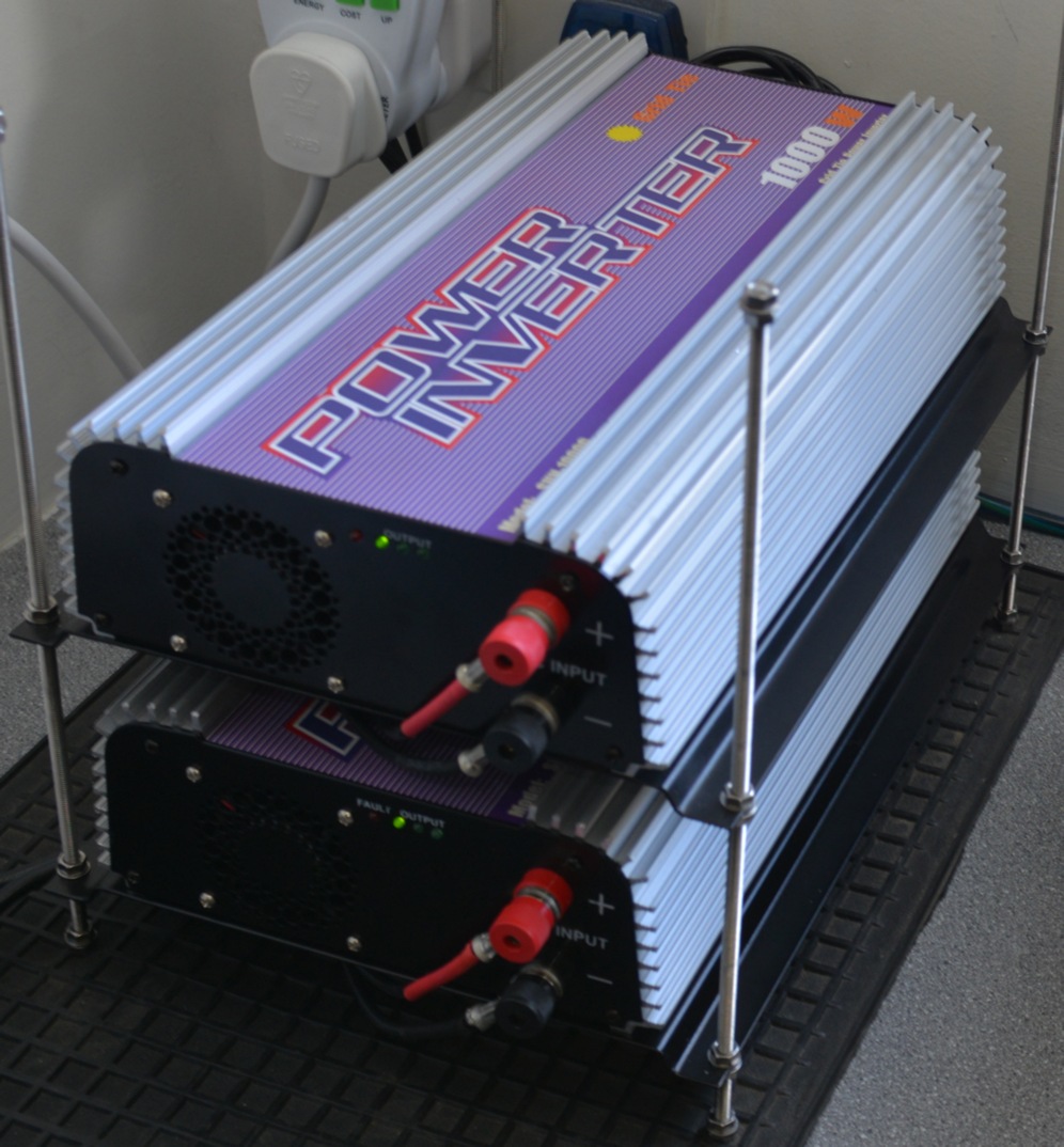 swapped 2 of these 4 small inverters for 2 of these SUN 1000w 240v Grid tie inverters. One has 3 panels from the high roofs. The other connects to the 3 panels on the lower flat roof. They run cooler and quieter and have a bigger reserve (headroom), and seem to track panel voltages better, and have larger quieter fans. The "old" 500 watt ones, will be used in the future for the panels I will fit at the bottom of the garden.