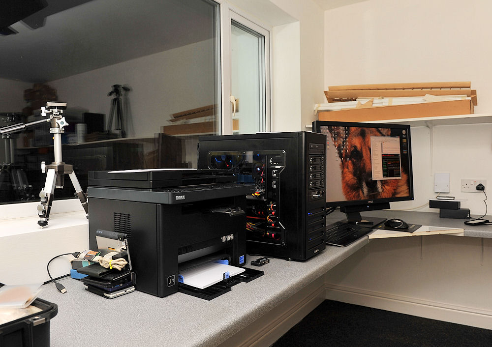My over clocked home built quad core, water cooled PC, with 8x hard disks, 12Gb fast RAM, 30 inch monitor... I am a nerd..