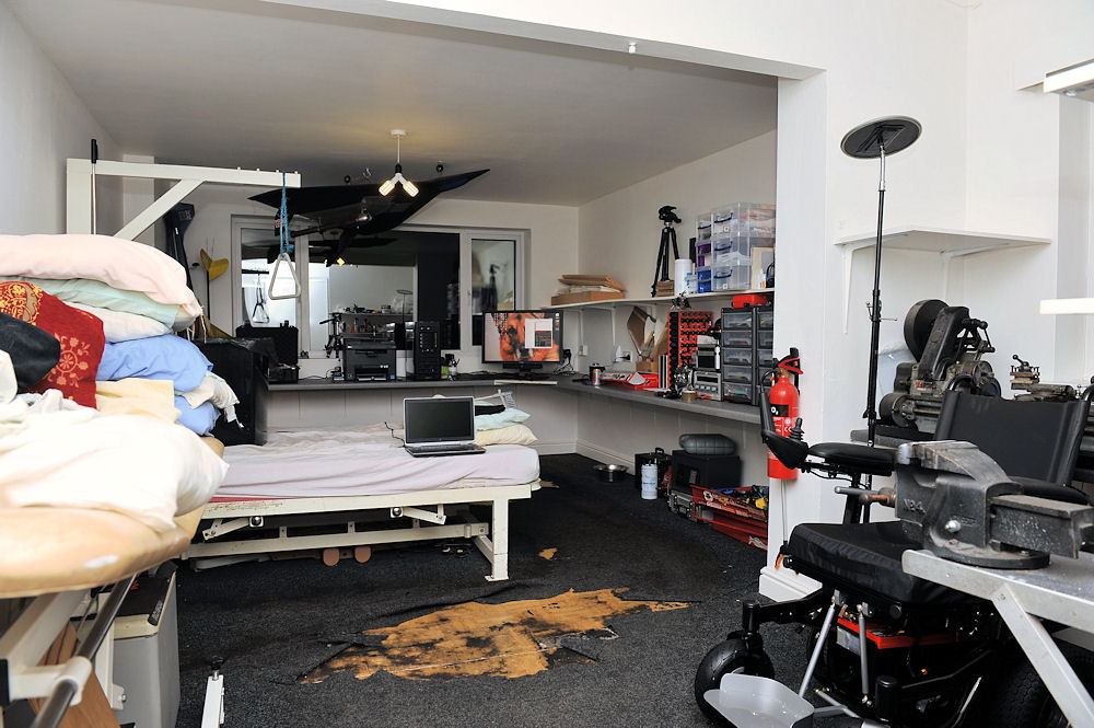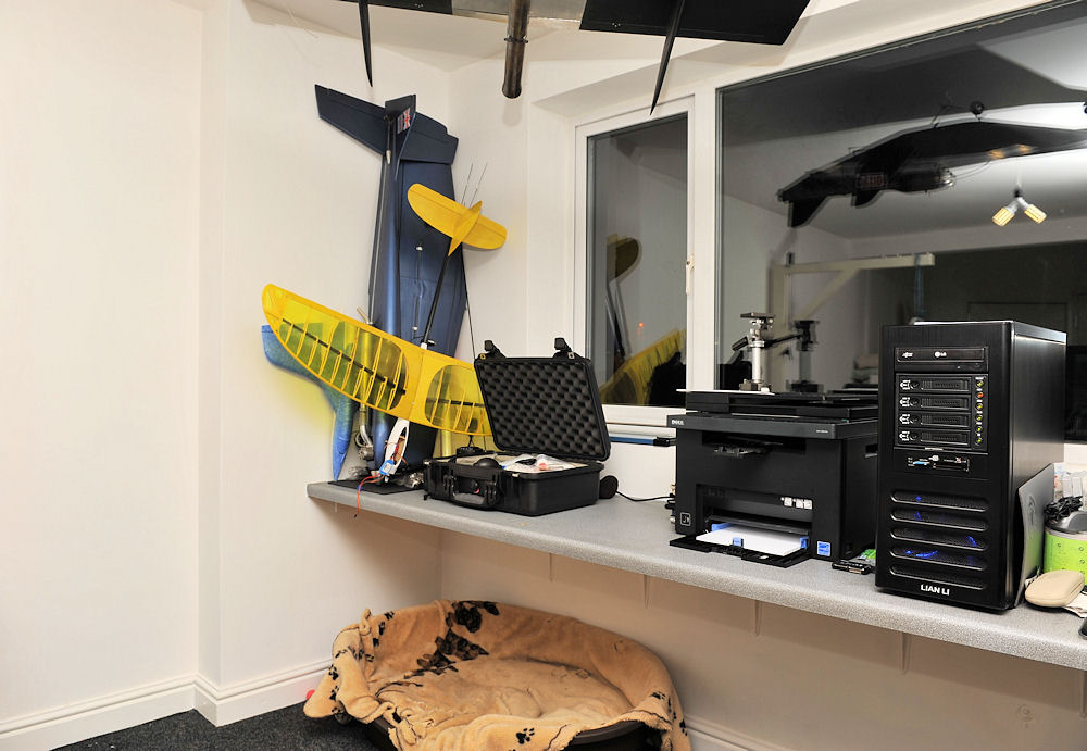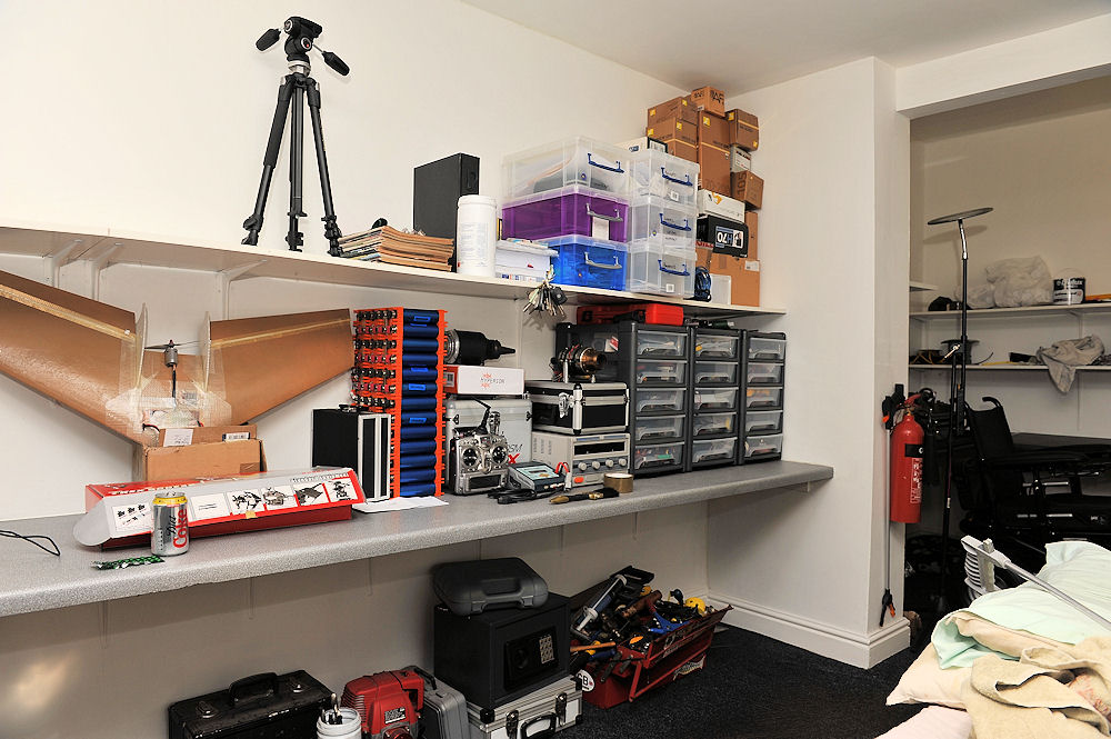Tripods, engines and cameras, tools, on the floor. Planes, batteries, chargers, files, paper, chargers, power supplies, jet engines, fire extinguisher, transmitter, Cable crimps, leads, trays of parts and bolts, bearings, brushes, connectors etc...