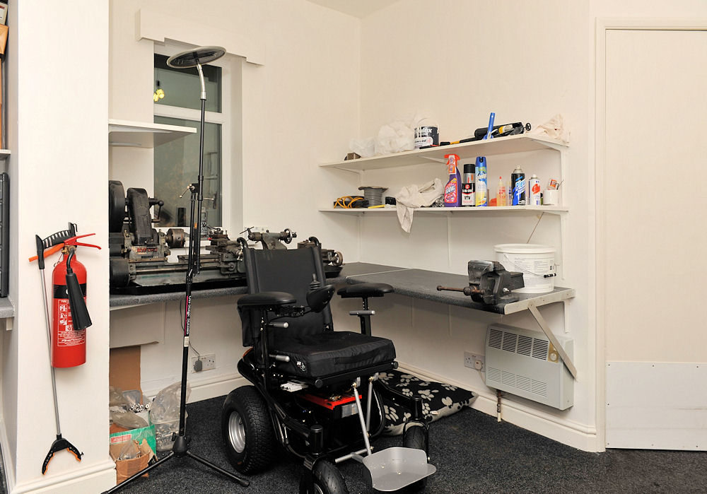 This corner is still being painted in a hurry so I can get a new carpet in, and carry on building my BM3 powerchair! Note boxes of stainless bolts on the floor, dog bed in the corner, and a vice, and Myford Lathe in the corner of my room... And another grabber on the fire extinguisher. And a 2 year old summer only BM2 chair sat in the way.